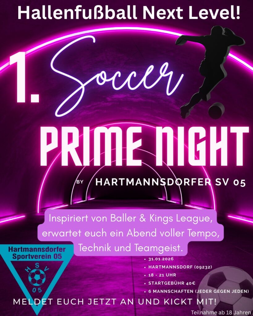 1. SOCCER PRIME NIGHT by Hartmannsdorfer SV 05 – Das Hallenfußball-Event des Jahres! ![]()